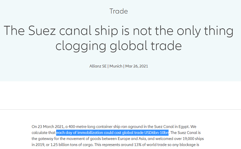 德国保险公司安联最新研究显示,搁浅导致的苏伊士运河封锁或使全球贸易每天损失60亿至100亿美元。