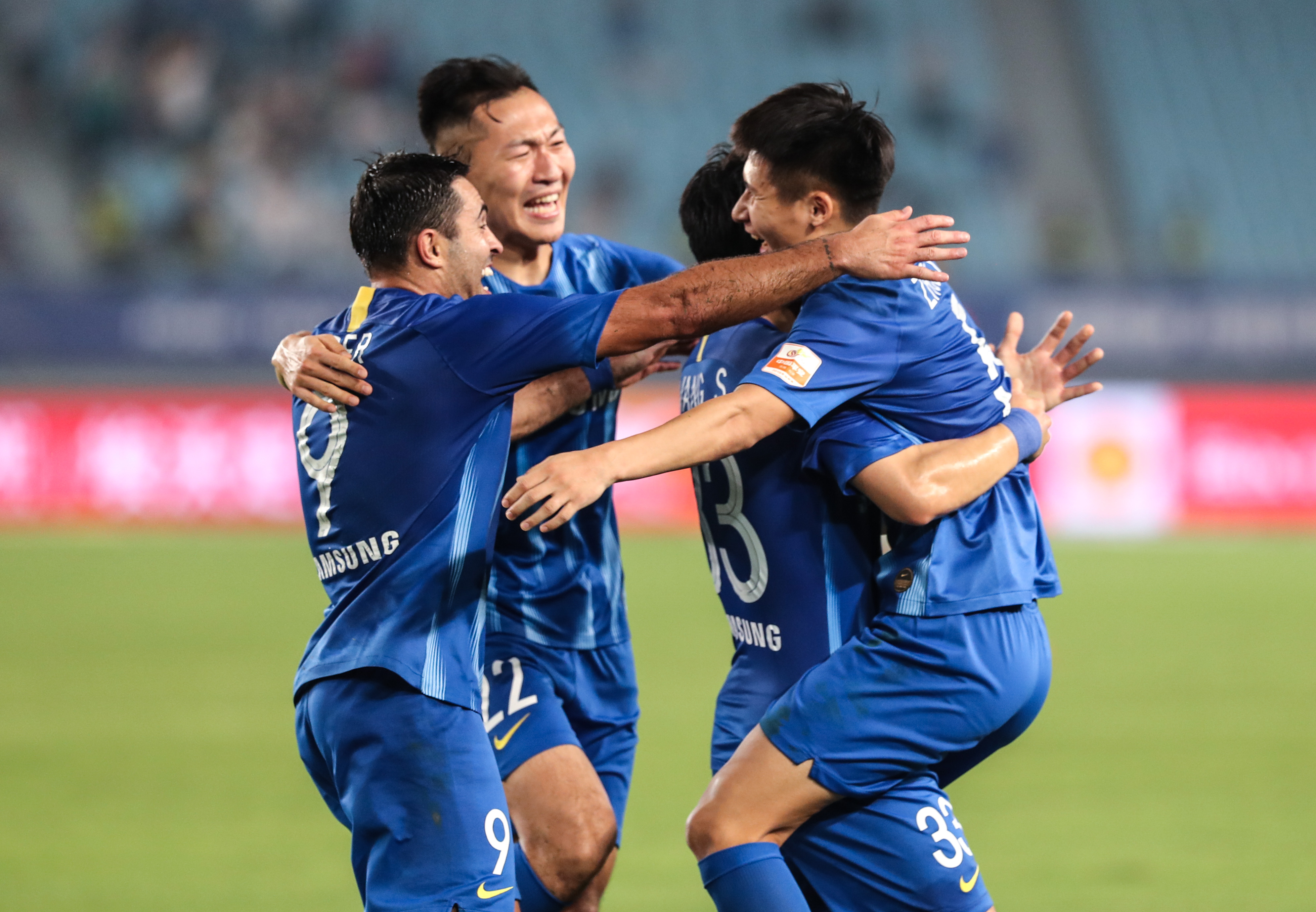 周云(右一)和队友庆祝进球。新华社记者杨磊摄