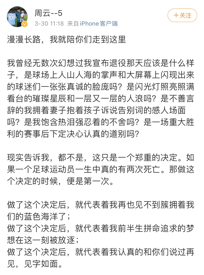 30日他在个人社交媒体上发长文告别:“如果一个足球运动员一生中真的有两次死亡,那做这个决定的时候,便是第一次。漫漫长路,我就陪你们走到这里。”