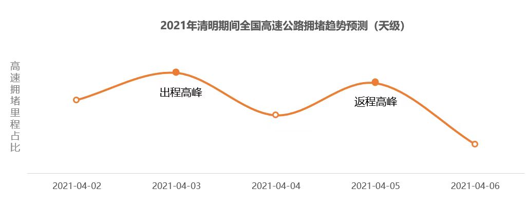 根据预测,受高速免费通行以及出行需求集中的影响,预计4月3日(清明小长假第一天)为高速出程拥堵高峰,4月5日(清明小长假最后一天)为高速返程拥堵高峰;节日期间高速交通流量基本呈现相同趋势。