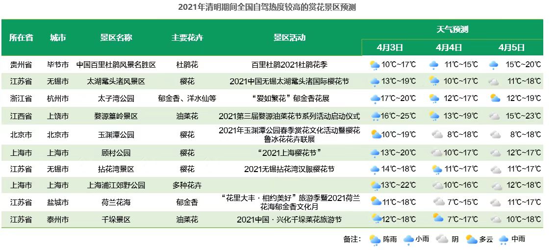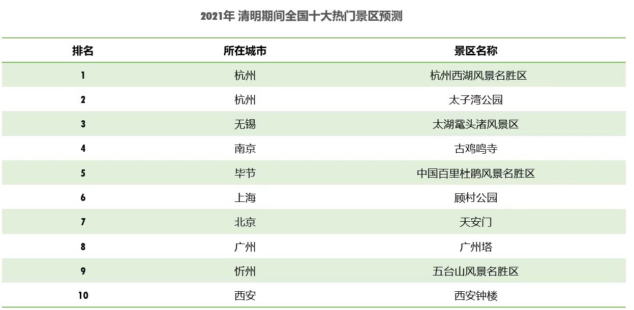 值得注意的是,预计清明假期杭州西湖风景名胜区最为热门,其次为太子湾公园、太湖鼋头渚风景区、古鸡鸣寺、中国百里杜鹃风景名胜区、顾村公园、天安门、广州塔、五台山风景名胜区、西安钟楼。