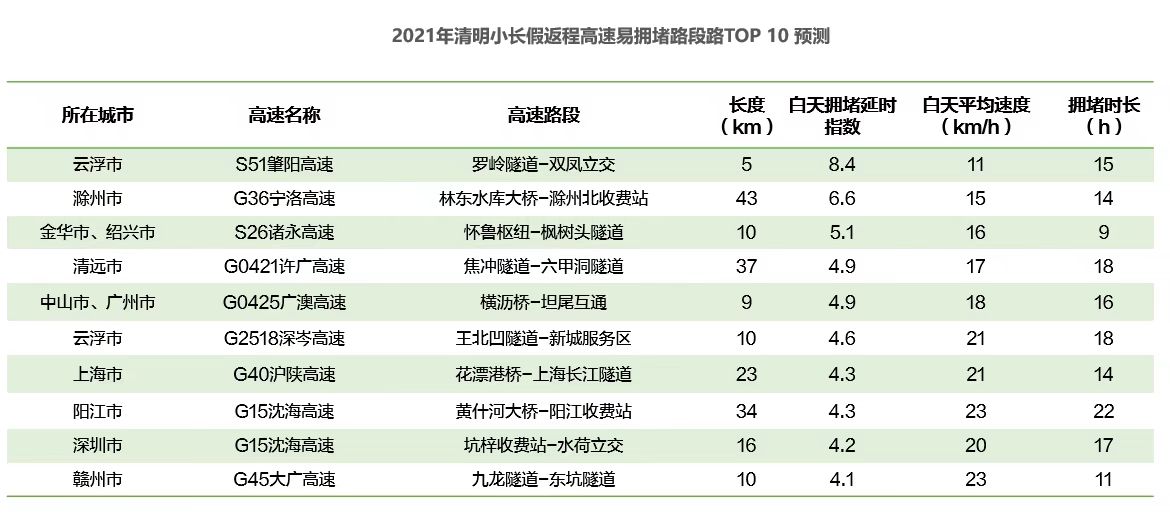 4月5日,全国高速返程较易拥堵的高速预计主要有:S51肇阳高速云浮段,白天拥堵延时指数为8.4,平均速度约11千米/小时,其次是G36宁洛高速滁州段以及S26诸永高速金华和绍兴段。建议计划途经上述路段的市民错峰出行。