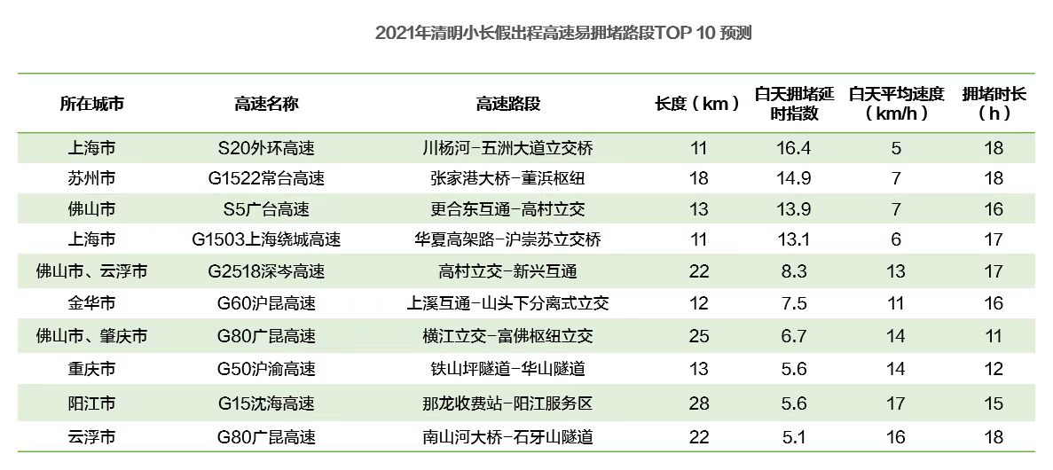 清明期间,最易拥堵路段预计有哪些?数据显示,4月3日全国高速出程较易拥堵的路段主要是上海S20外环高速,白天拥堵延时指数达16.4,平均速度仅为5千米/小时,其次是G1522常台高速苏州段和S5广台高速佛山段。