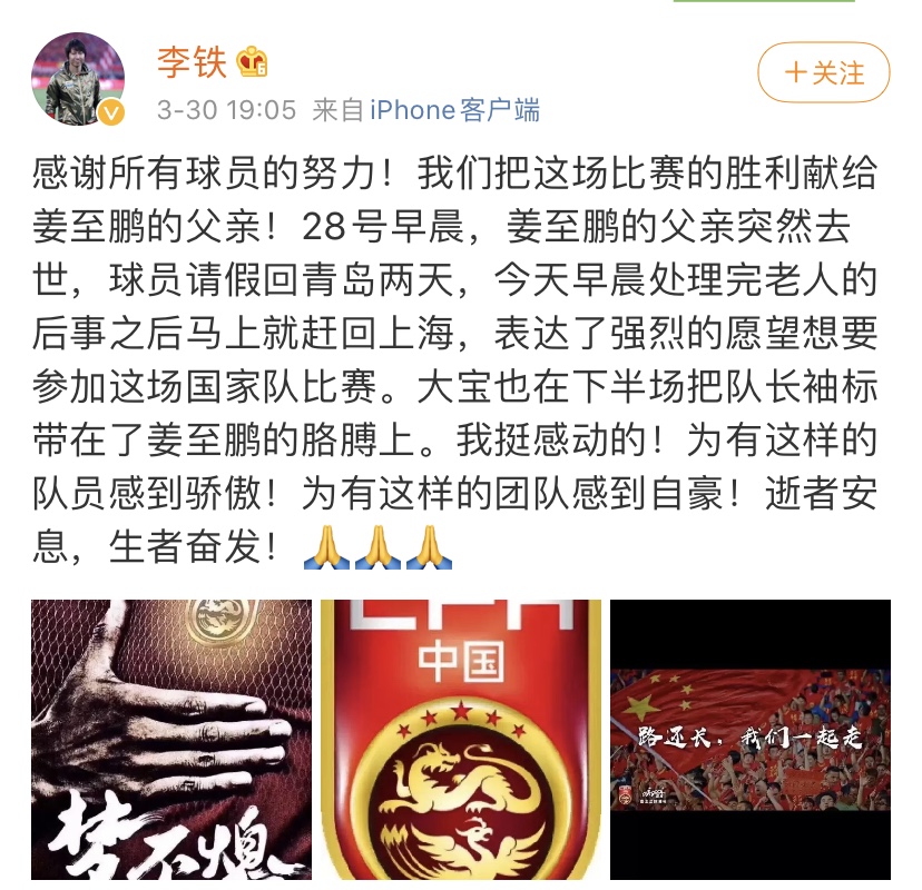 赛后,主帅李铁专门发文称:“感谢所有球员的努力!我们把这场比赛的胜利献给姜至鹏的父亲!28日早晨,姜至鹏的父亲突然去世,球员请假回青岛两天,今天早晨处理完老人的后事之后马上就赶回上海,表达了强烈的愿望想要参加这场国家队比赛。大宝也在下半场把队长袖标戴在了姜至鹏的胳膊上。我挺感动的!为有这样的队员感到骄傲,为有这样的团队感到自豪!逝者安息,生者奋发!”