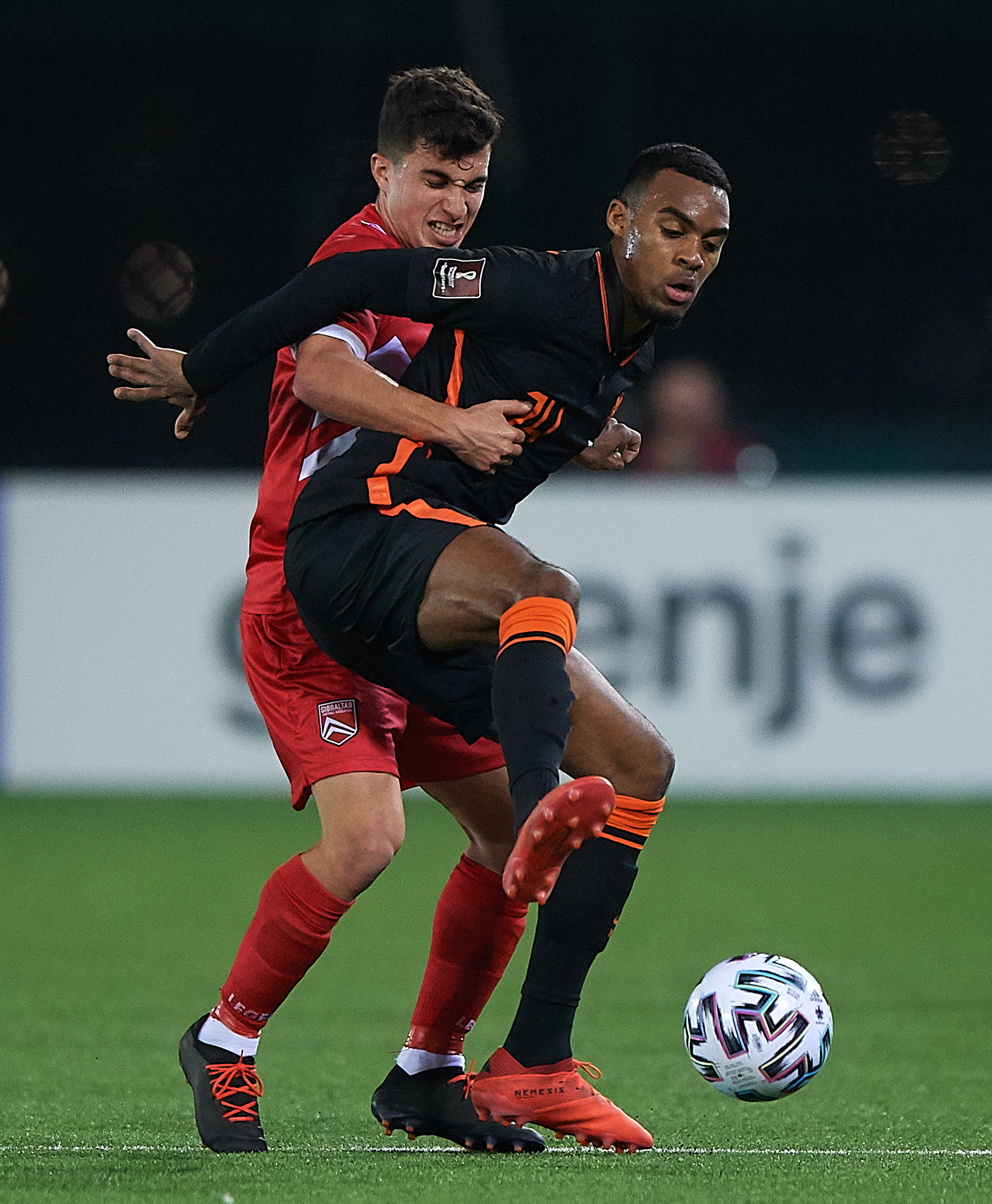3月30日,荷兰队球员格拉文贝尔奇(右)与直布罗陀队球员基安·罗南在比赛中拼抢。新华社发(帕布罗·莫拉诺摄)