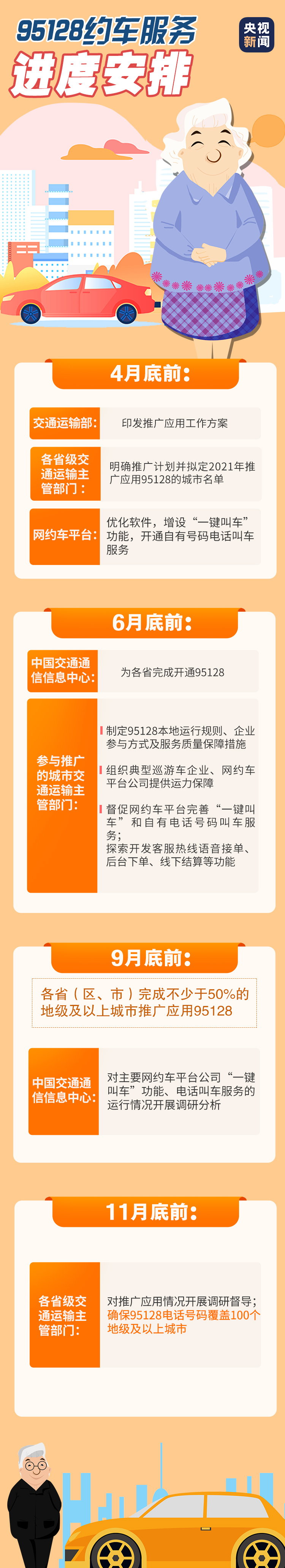 近日,交通运输部印发《2021年便利老年人打车出行工作方案》,要求2021年11月底前,实现95128约车服务电话号码覆盖100个地级及以上城市。推动主要网约车平台公司开通电话叫车服务,优化约车软件,为老年人增设“一键叫车”功能。