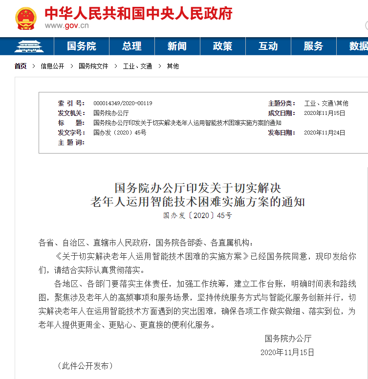 《关于切实解决老年人运用智能技术困难的实施方案》