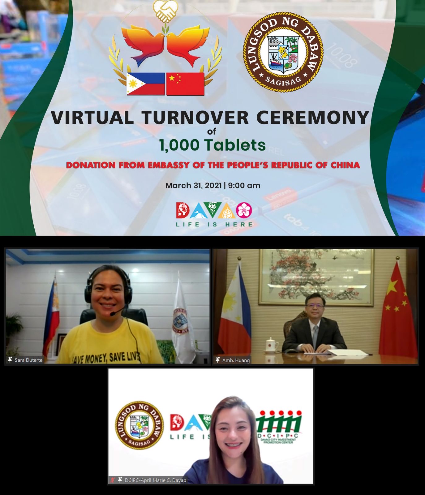 当地时间3月31日,中国驻菲律宾使馆向菲律宾达沃市政府捐赠1000台平板电脑,助力疫情下的远程教育。黄溪连大使同达沃市市长莎拉·杜特尔特共同出席线上交接仪式。