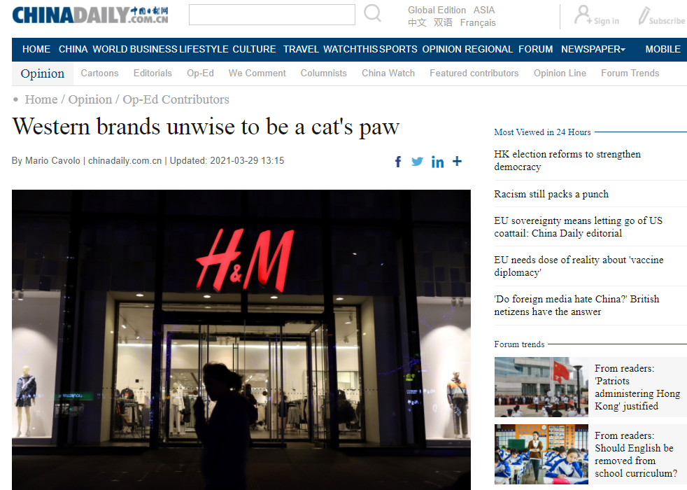 H&M的一些高管认为,基于虚假指控的“官方”声明就可以撇清自己。一方面,该公司受益于中国消费者,另一方面,却完全不相信中国的声明,新疆的维吾尔族棉农不是奴隶劳工。也许,H&M真的认为,中国就像当年的美国黑人奴隶那样被强迫在棉花种植园工作。