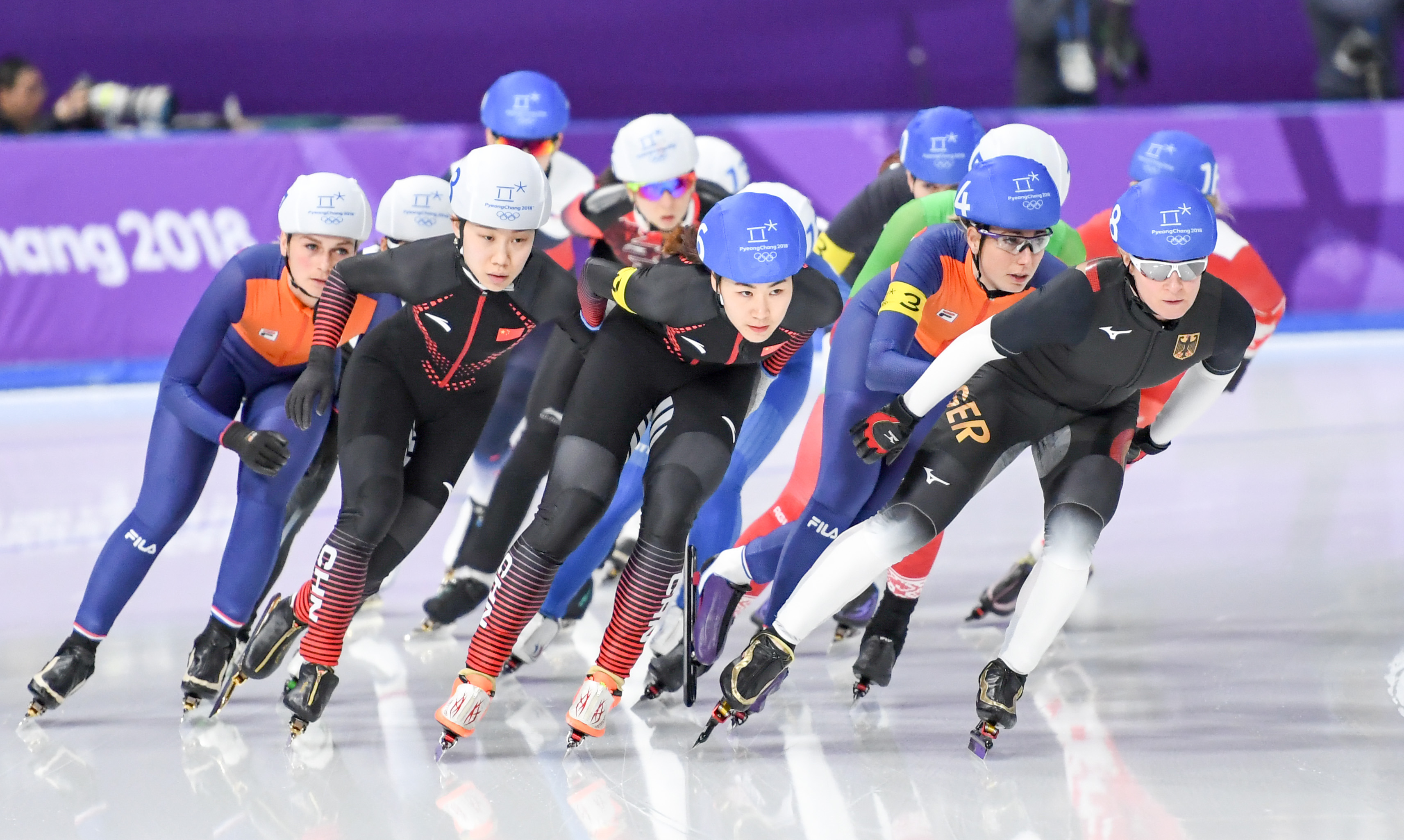 资料图:2018年2月24日,郭丹(左三)在比赛中。新华社记者王松摄