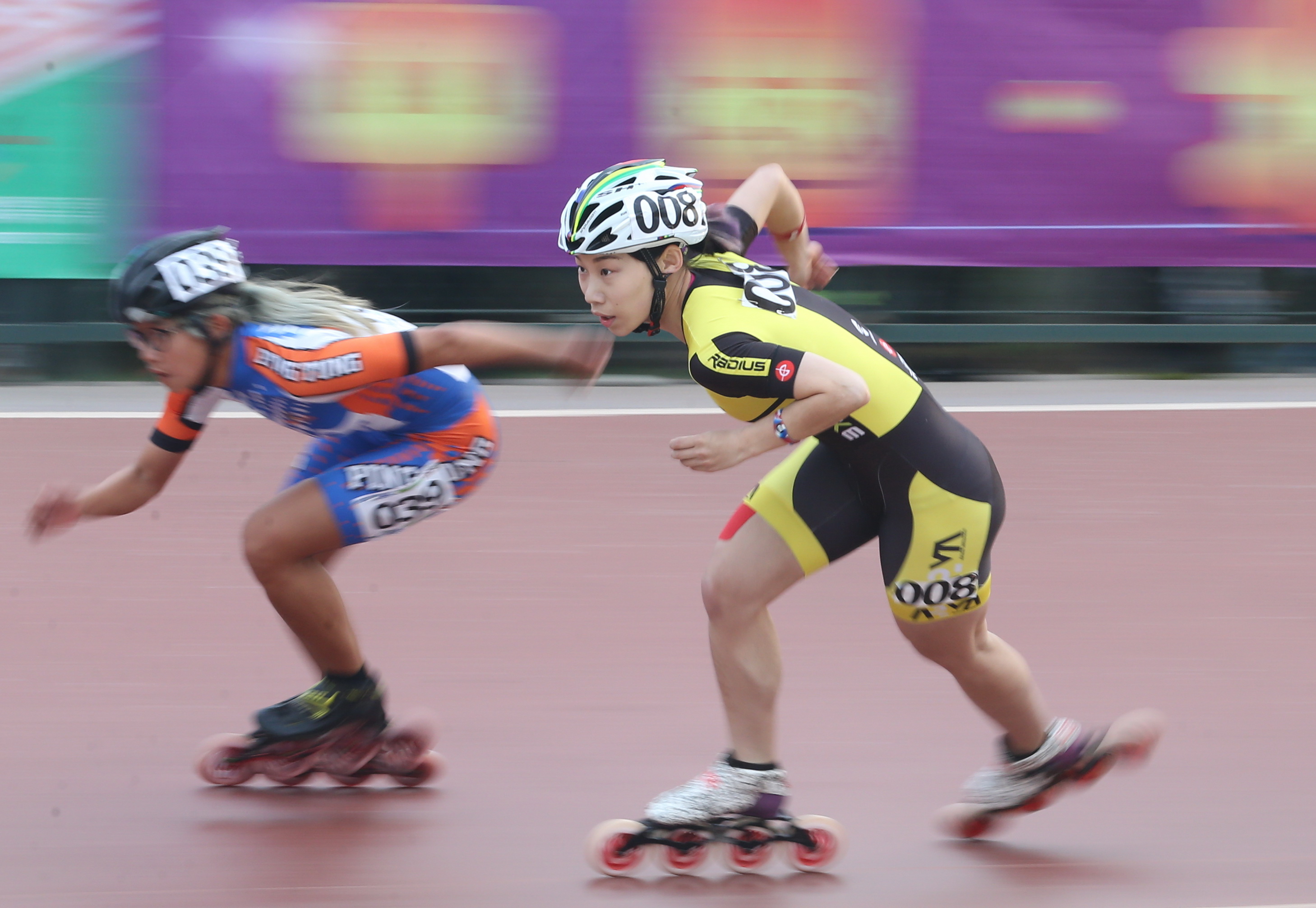 资料图:郭丹(右)在速度轮滑比赛中。新华社记者杨世尧摄