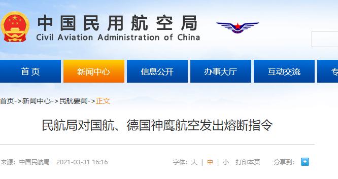 3月31日,民航局再发熔断指令,对国航CA910航班(莫斯科至兰州)、德国神鹰航空公司DE8442航班(法兰克福至西安)实施熔断措施。