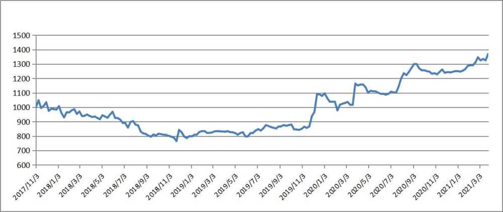 3月26日,指数报1370.30点,较上期(2021.3.15-3.21下同)上涨44.68点,涨幅3.37%,与基期相比上涨370.30点,涨幅37.03%。