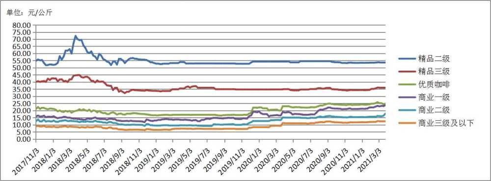具体来看,精品二级咖啡豆均价报53.64元/公斤,较上期持平;精品三级咖啡豆均价报35.97元/公斤,较上期上涨0.02元/公斤,涨幅0.06%;优质咖啡豆均价报24.81元/公斤,较上期上涨0.39元/公斤,涨幅1.60%;商业一级咖啡豆均价报23.80元/公斤,较上期上涨0.80元/公斤,涨幅3.48%;商业二级咖啡豆均价报17.80元/公斤,较上期上涨1.51元/公斤,涨幅9.27%;商业三级及以下咖啡豆均价报12.42元/公斤,较上期持平。