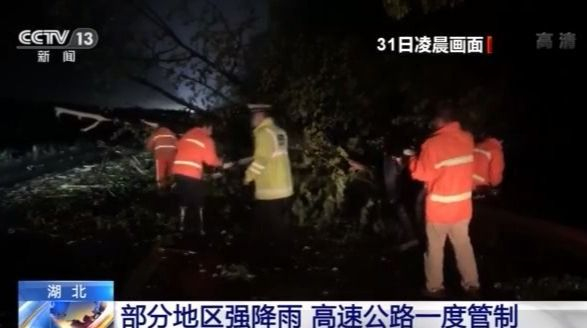 昨晚六点,武汉、荆门等地相继发布暴雨橙色预警。今天(31日)凌晨在京港澳高速武汉段,强降雨中一棵大树被大风刮断,倒伏在高速公路车道内。