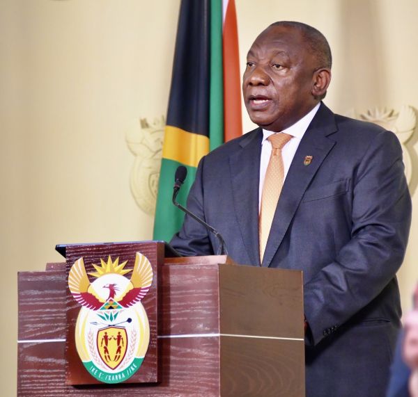 2020年4月23日,在南非比勒陀利亚,南非总统西里尔·拉马福萨发表全国电视讲话。 新华社发