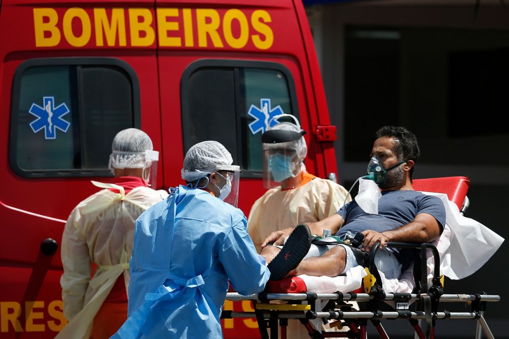 3月25日,医务人员在巴西首都巴西利亚移送新冠患者。根据巴西卫生部统计,该国当天新增新冠确诊病例100158例。(新华社发,卢西奥·塔沃拉摄)