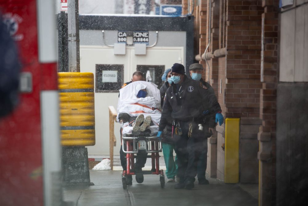 2月22日,美国纽约的医护人员在一家医院外运送病人。(新华社发,郭克摄)