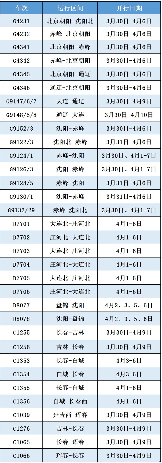为满足旅客,清明小长假出行需求,中国铁路沈阳局集团公司,优化调整运输方案,从3月30日起,北京、大连、赤峰、通辽等方向,增开33趟旅客列车。