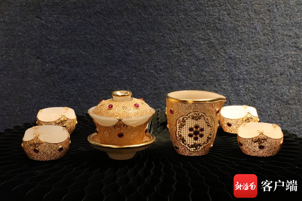 如何更接近老百姓的生活?楚釹子在构思一个接地气的作品,她来想去,构思制作一套工夫茶具,制作成成品,只耗费了1个多月的时间。这套别出心裁的工夫茶具,用料选择地方玉,她分别在公道杯、茶杯、茶壶的身上,用花丝镶嵌给它们编制上“衣服”,考虑到金丝传导热量会很快,她将茶杯四周嵌入了红宝石。