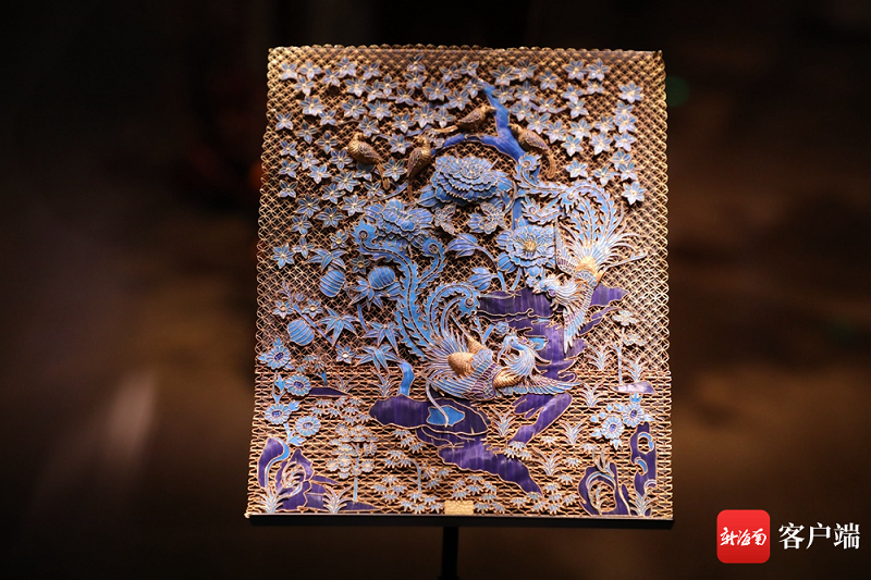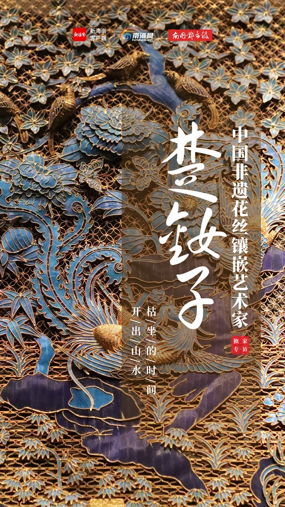 进入海南省博物馆花丝镶嵌艺术品展厅,一个玻璃展柜让记者停下脚步,“采金为丝,妙手编结,嵌玉缀翠,是为一绝。”这是一副尺寸类似A4纸面大小的《凤凰图》。《凤凰图》是楚釹子最喜爱的一个作品,底层是由全金的花丝镶嵌做的底,这份作品别具匠心之处,是在底层之上,又覆盖了一层花丝镶嵌,小鸟活泼生动,蓝色的凤凰长尾飘逸,不失空灵,楚釹子对此喜爱有加,她说,“《凤凰图》是千金不换的。”