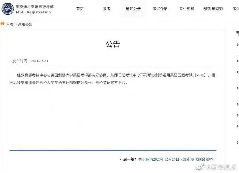 教育部考试中心31日发布公告称,经教育部考试中心与英国剑桥大学英语考评部友好协商,从即日起考试中心不再承办剑桥通用英语五级考试(MSE)。据了解,剑桥通用英语五级考试包括近来颇受社会关注的KET、PET、FCE等考试。详情>>>