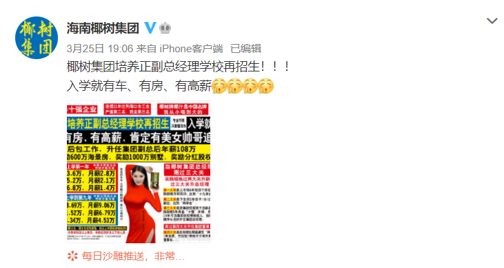 近日,海南省市场监管局依法对椰树集团海南椰汁饮料有限公司(以下简称椰树集团)发布涉嫌违法广告的行为进行立案调查。今年3月25日,椰树集团在其官方微博上发布“椰树集团培养正、副总经理学校再招生!!!专业不限只要懂写作,入学就有车、有房、有高薪、肯定有美女帅哥追”等内容的广告,引发社会争议。详情>>>