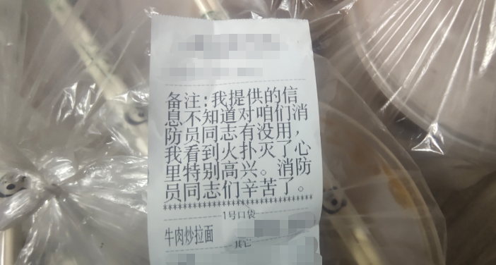 昨天(30日)19时左右,浙江省嘉善县惠民街道消防救援站收到一份匿名外卖,内有8份牛肉炒拉面。外卖订单上备注着:“我提供的信息不知道对咱们消防员同志有没有用,我看到火扑灭了心里特别高兴。消防员同志辛苦了!——张先生”。