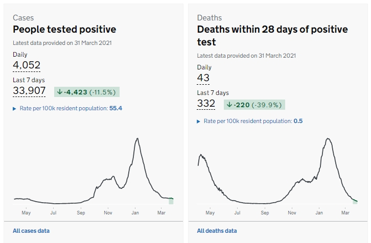当地时间3月31日,英国卫生和社会保障部公布最新数据显示,过去24小时英国新增新冠肺炎确诊病例4052例,累计确诊4345788例;新增死亡病患43例,累计死亡126713例。(总台记者 康玉斌)