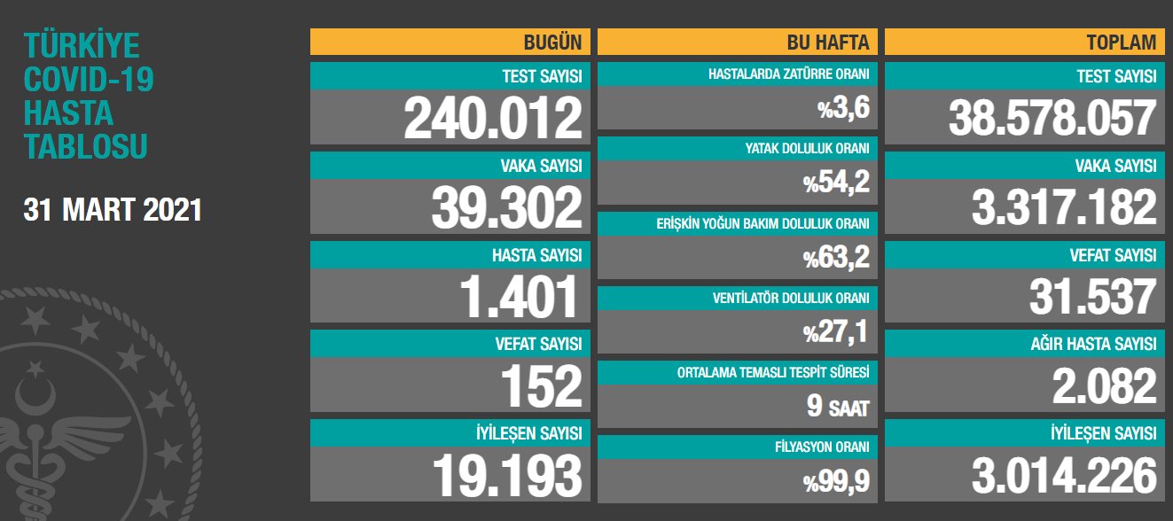 当地时间3月31日晚,土耳其卫生部网站更新的数据显示,3月31日土耳其进行了240012次新冠病毒检测,其中39302人检测结果呈阳性。至此,土耳其新冠肺炎累计确诊3317182例。当天新增152例死亡病例,累计死亡31537例。当天治愈19193例,累计治愈3014226例。土耳其总计进行了38578057次检测,目前重症患者2082例。