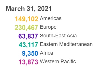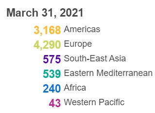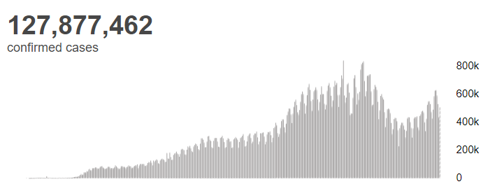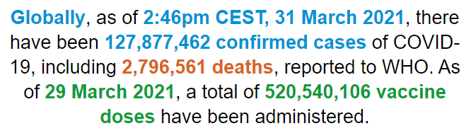 根据世卫组织最新实时统计数据,截至欧洲中部夏令时间3月31日14时46分(北京时间3月31日20时46分),全球累计新冠肺炎确诊病例127877462例,累计死亡病例2796561例。31日全球新冠肺炎确诊病例新增509746例,死亡病例新增8855例。