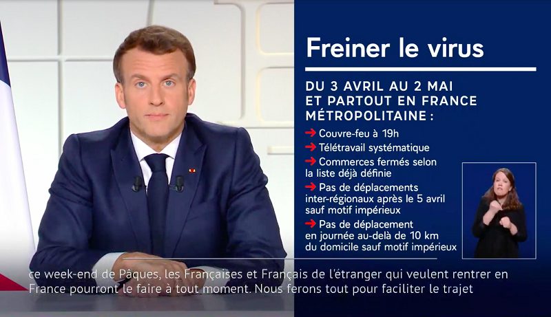 马克龙在电视讲话中宣布了新抗疫措施,主要包括,从4月3日起的四周时间里,目前在19个省份实行的封禁措施扩大到法国本土全境。在此期间,民众白天可以在住所周围10公里范围内不受时间限制出行。从4月5日起禁止非必要跨地区出行,每天19时起实施宵禁,尽量远程办公以及关闭所有非必要商业设施。第二,就法国社会争议最大的是否关闭学校问题,马克龙表示,从4月5日一周开始,全国的幼儿园和小学将关闭三周,中学将关闭4周。大学仍将保持每周到校上课一天。