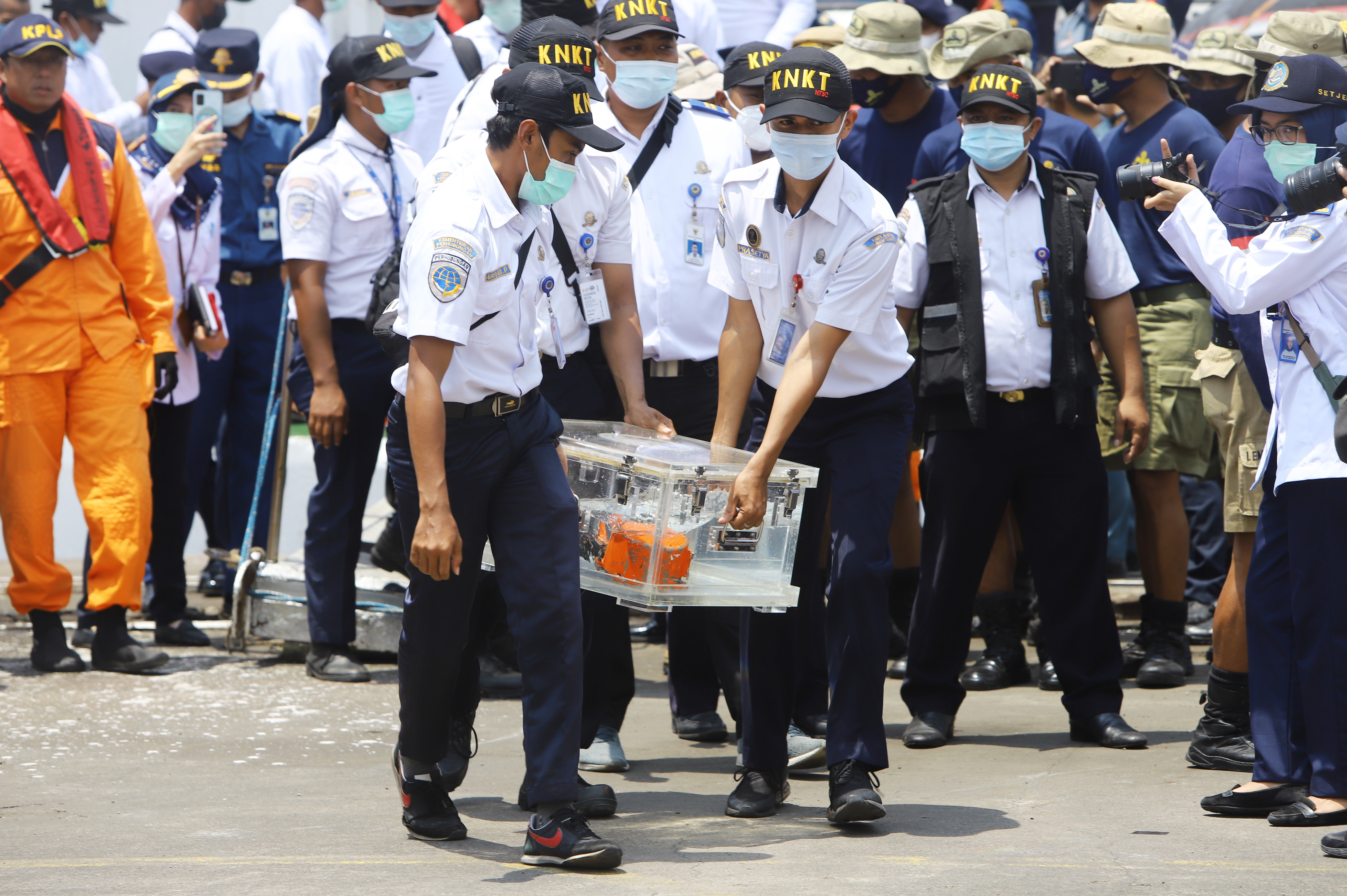 3月31日,印度尼西亚搜救人员在雅加达丹戎不碌港将装有失事客机驾驶舱语音记录仪的盒子搬运下船。(新华社发,纳鲁摄)