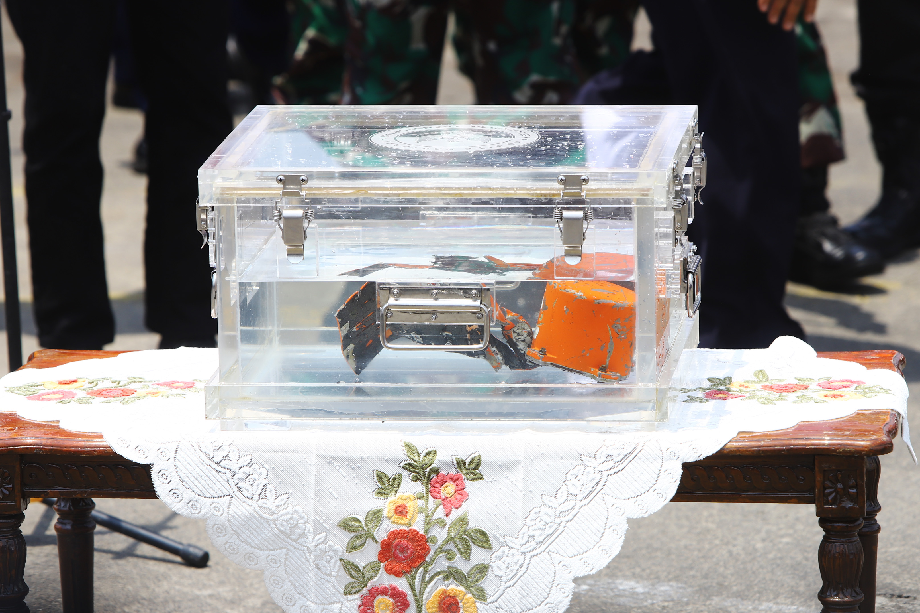 3月31日在印度尼西亚雅加达丹戎不碌港拍摄的装有失事客机驾驶舱语音记录仪的盒子。(新华社发,纳鲁摄)