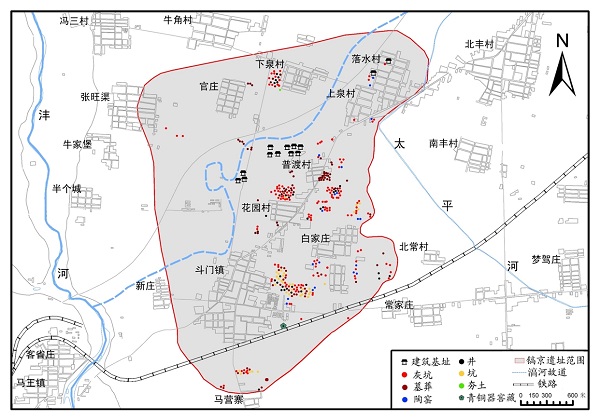 △镐京遗址范围及发现的大型建筑基址和其他遗迹分布图