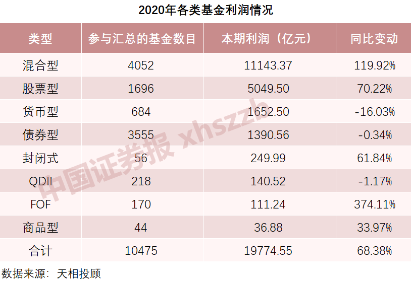2020年公募基金共为基民赚取了19774.55亿元的利润,同比增加68.38%。