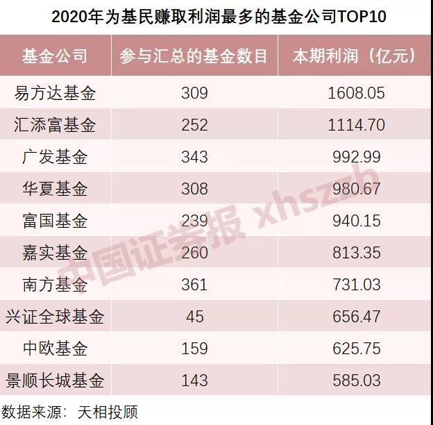 易方达基金2020年为基民赚取了1608.05亿元的利润,汇添富也为基民赚取了超千亿元的利润。最赚钱的10家基金公司均为基民赚取了超500亿元的利润。(完)