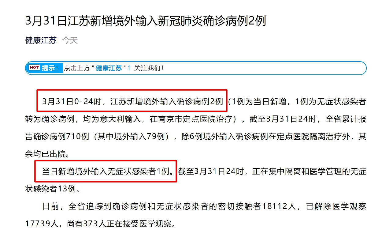 3月31日0—24时,江苏新增境外输入确诊病例2例(1例为当日新增,1例为无症状感染者转为确诊病例,均为意大利输入,在南京市定点医院治疗)。截至3月31日24时,江苏累计报告确诊病例710例(其中境外输入79例),除6例境外输入确诊病例在定点医院隔离治疗外,其余均已出院。