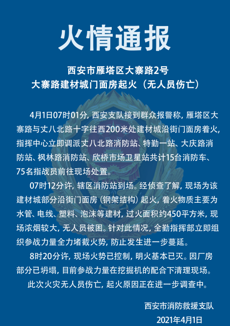 记者从陕西西安市消防救援支队了解到,4月1日7时左右,西安消防接到报警,西安市雁塔区大寨路与丈八北路十字往西200米处建材城沿街门面房着火,指挥中心立即调派15台消防车、75名指战员前往现场处置。