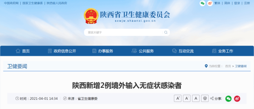 据陕西省卫健委通报:3月31日0至24时,陕西无新增报告新冠肺炎本地确诊病例、疑似病例、无症状感染者。