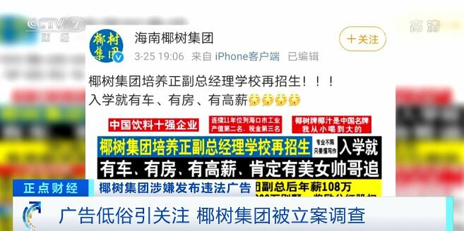 3月25日,椰树集团在其官方微博上发布了一则广告,广告内容显示:“椰树集团培养正副总经理学校再招生!!!专业不限只要懂写作,入学就有车、有房、有高薪、肯定有美女帅哥追”。广告发布后引发了社会争议。3月31日,海南日报报道,海南省市场监管局迅速对椰树集团相关负责人进行了行政约谈,也对椰树集团涉嫌发布违法广告的行为进行立案调查。2019年,椰树椰汁曾因广告涉低俗虚假问题被当地市场监管部门立案调查。