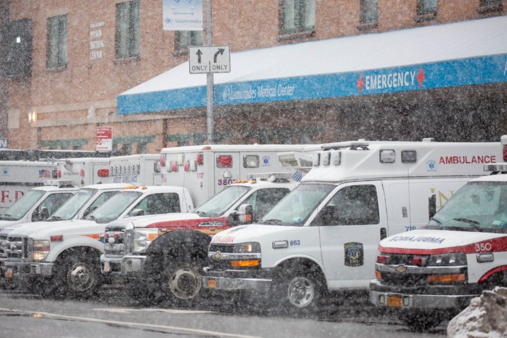 2月22日,救护车辆停放在美国纽约一家医院外。(新华社发,郭克摄)