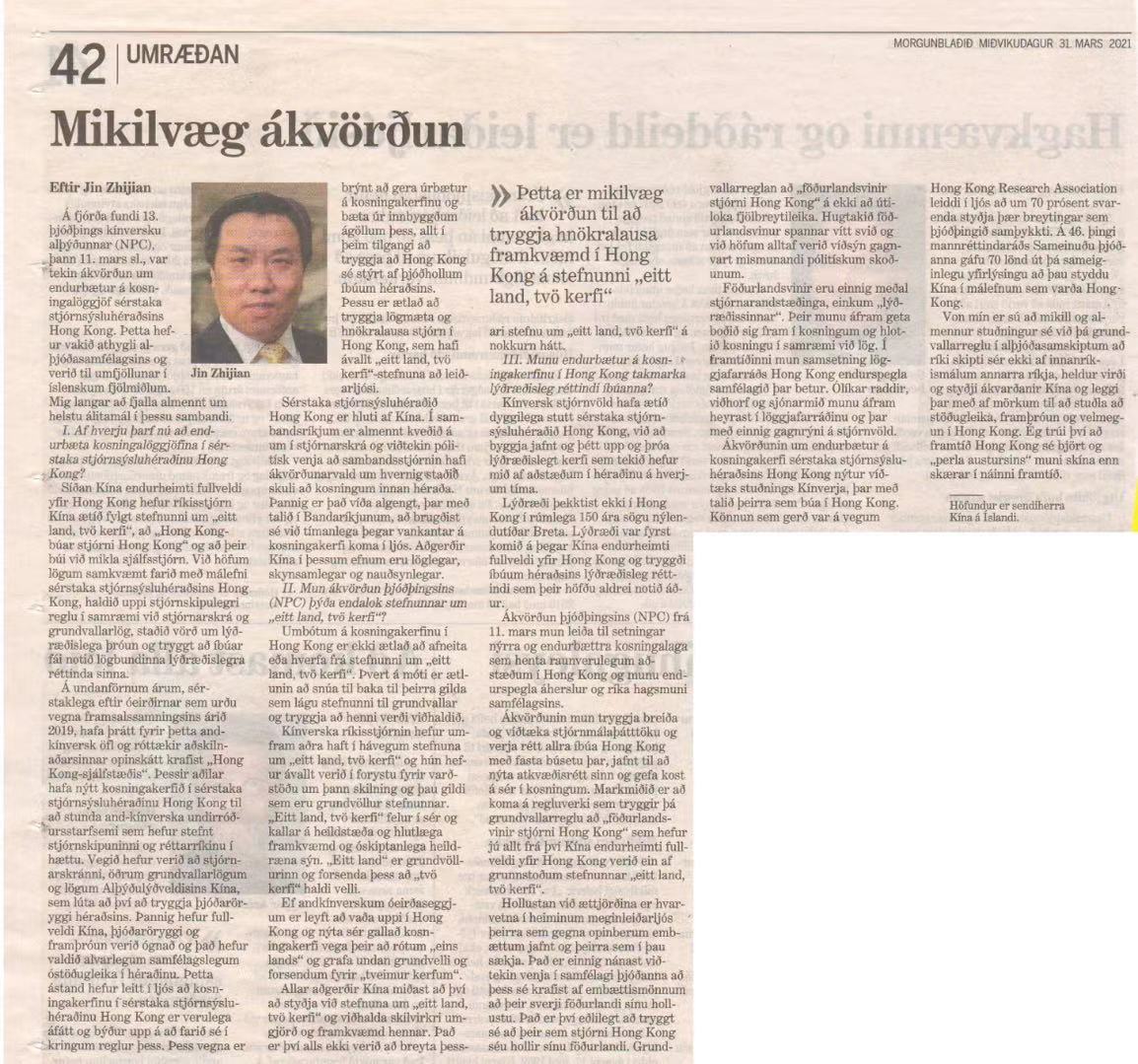 2021年3月31日,中国驻冰岛大使金智健在冰岛主流媒体《晨报》上发表题为《确保“一国两制”在香港顺利实施的重要之举》的署名文章。内容如下: