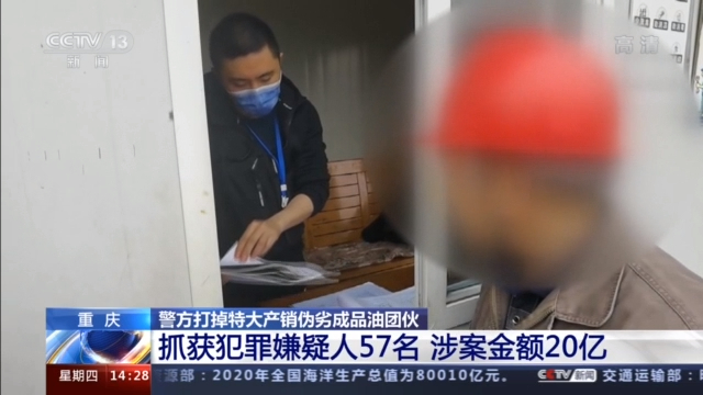 日前,重庆警方打掉一个特大生产、销售伪劣成品油犯罪团伙,抓获犯罪嫌疑人57名,查获伪劣成品油及制假原料1万多吨,总涉案金额达20亿元。