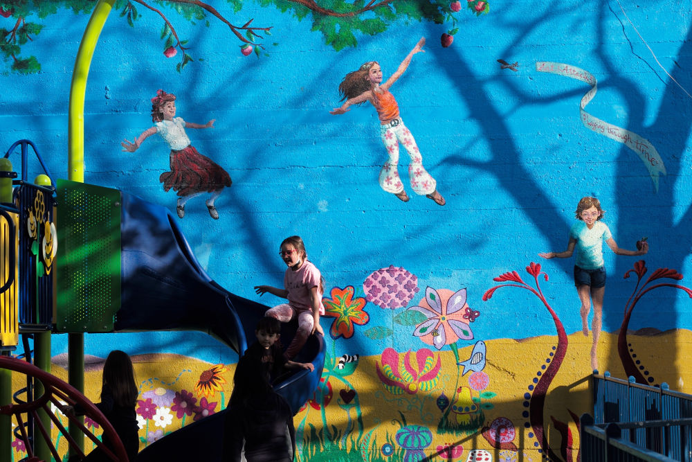 3月29日,儿童在美国加利福尼亚州北部小城伯灵格姆街头的一个重新开放的游乐场玩耍。(新华社记者吴晓凌摄)