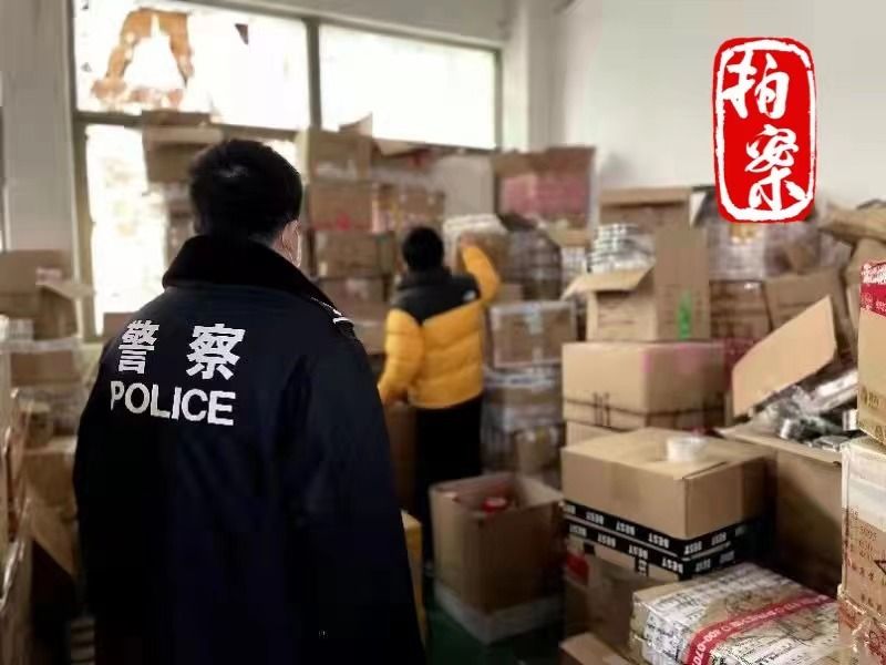 上海警方在犯罪嫌疑人的仓库中清点赃物