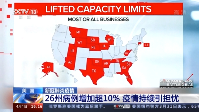 另据美国哥伦比亚广播公司报道,尽管美国卫生专家和官员一再警告称,不应过早放松疫情防控措施,但是目前美国有18个州取消了大多数商业活动的经营限制,有19个州没有强制要求戴口罩。美国一些医生、专家和卫生官员不得不一再呼吁各地在推进疫苗接种的同时,继续推行戴口罩和保持社交距离等措施。