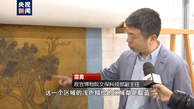故宫博物院文保科技部副主任 雷勇:我们就用多光谱不同的光谱范围的滤镜去摄取颜料的信息,就像刚才说的靛蓝,靛蓝在可见光它是有吸收的,但是在近红外没有吸收,所以通过这个方法,我们就可以获得整个这一个区域的浅色描绘的区域都是靛蓝。