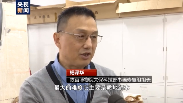 故宫博物院书画修复组组长 杨泽华:最大的难度它主要是质地绢本而且太残破,尺寸超大,这个画不怕长,特别怕幅宽,幅宽一增大以后,比如说在清洗、翻身等于这些工序会增加很多很大的难度,而且在那边看到质地特别破损,有很多卷的质地已经成了碎末的状态了。