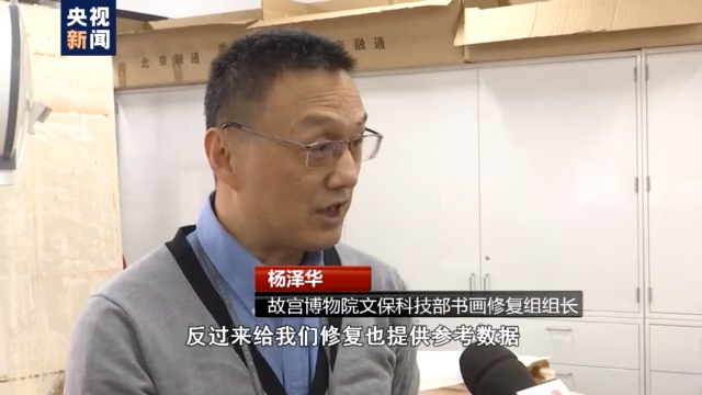 故宫博物院书画修复组组长 杨泽华:反过来给我们修复也提供参考数据。铜这些含量,包括朱砂,哪个部分使用朱砂了,朱砂有跟别的颜色调和的部分,肉眼可能是看不出来的,只有检测的仪器是非常真实的反应这些数据。